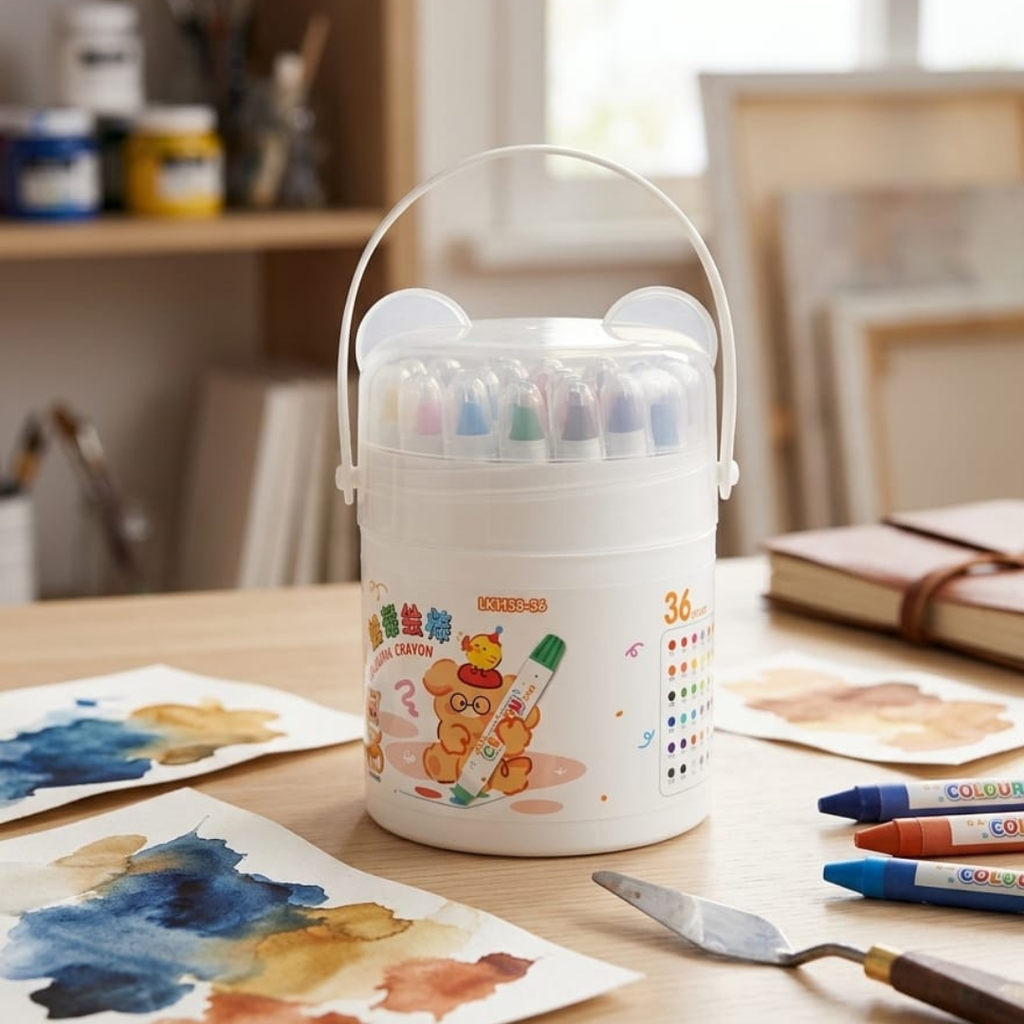 This crayon set is specially designed for children and professionals combining safety, creativity, and fun. The set includes 12,24,36 & 48 vibrant crayons and a water-dip brush. Made from non-toxic, eco-friendly materials. The crayons are easily washable from skin, clothes, or furniture with just a wet cloth or mild detergent. The design is perfect for little hands, promoting fine motor skills and early artistic expression. The smooth, silky texture makes coloring a joy.