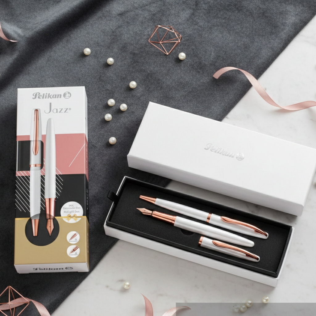 Elevate your writing experience with the Jazz Pearl Classic Gift Set, featuring a ballpoint and fountain pen crafted in Germany. Both pens showcase a pearlescent white lacquer finish accented by elegant rose gold trim. The spring-loaded clip ensures secure attachment, combining functionality with refined style. Presented in a Pelikan gift box, this set is an ideal choice for discerning professionals and collectors seeking timeless sophistication.
